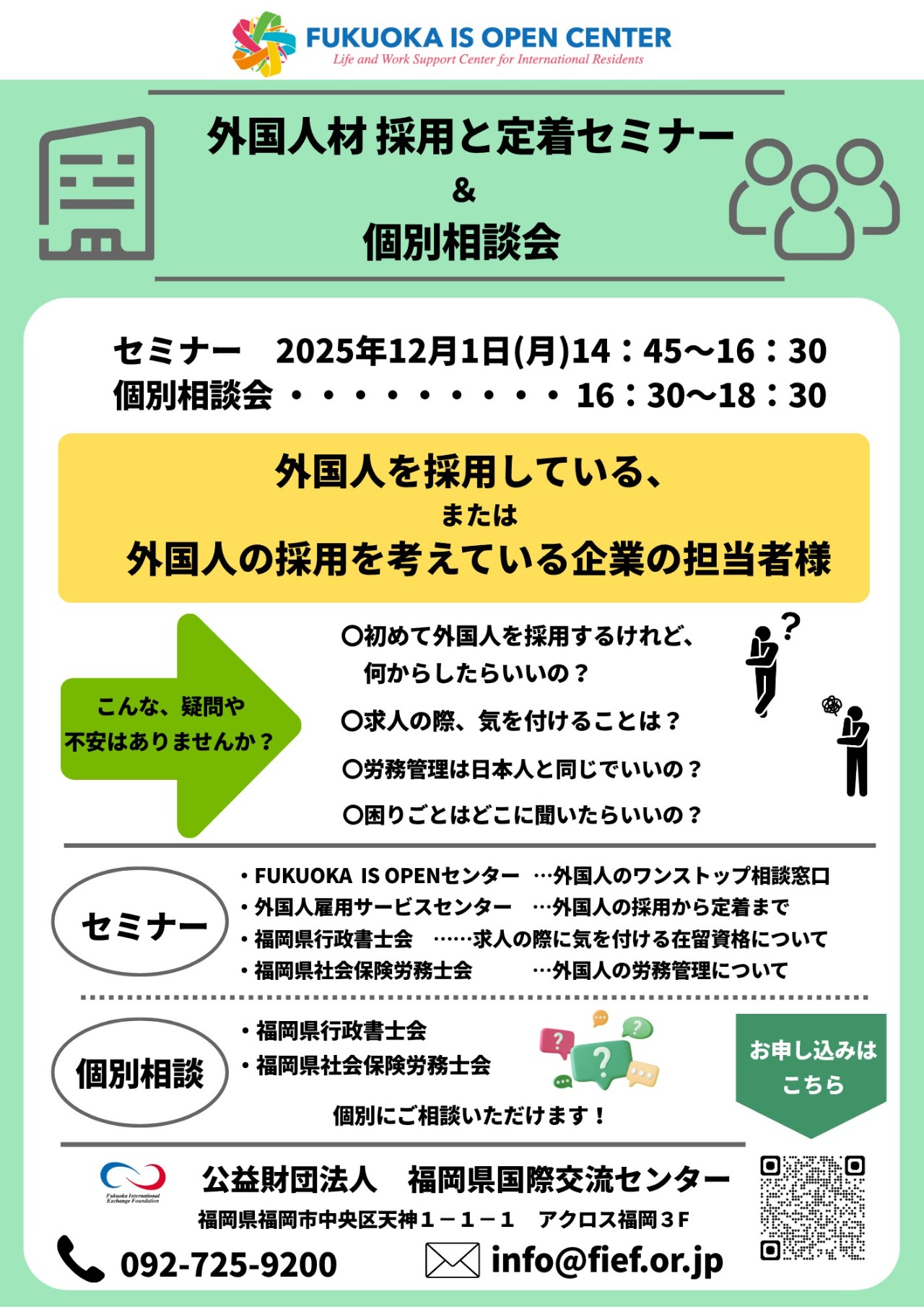 NEW 【参加無料】外国人材の採用と定着に関する企業向けセミナー及び個別相談会 就職活動 2025.11.26