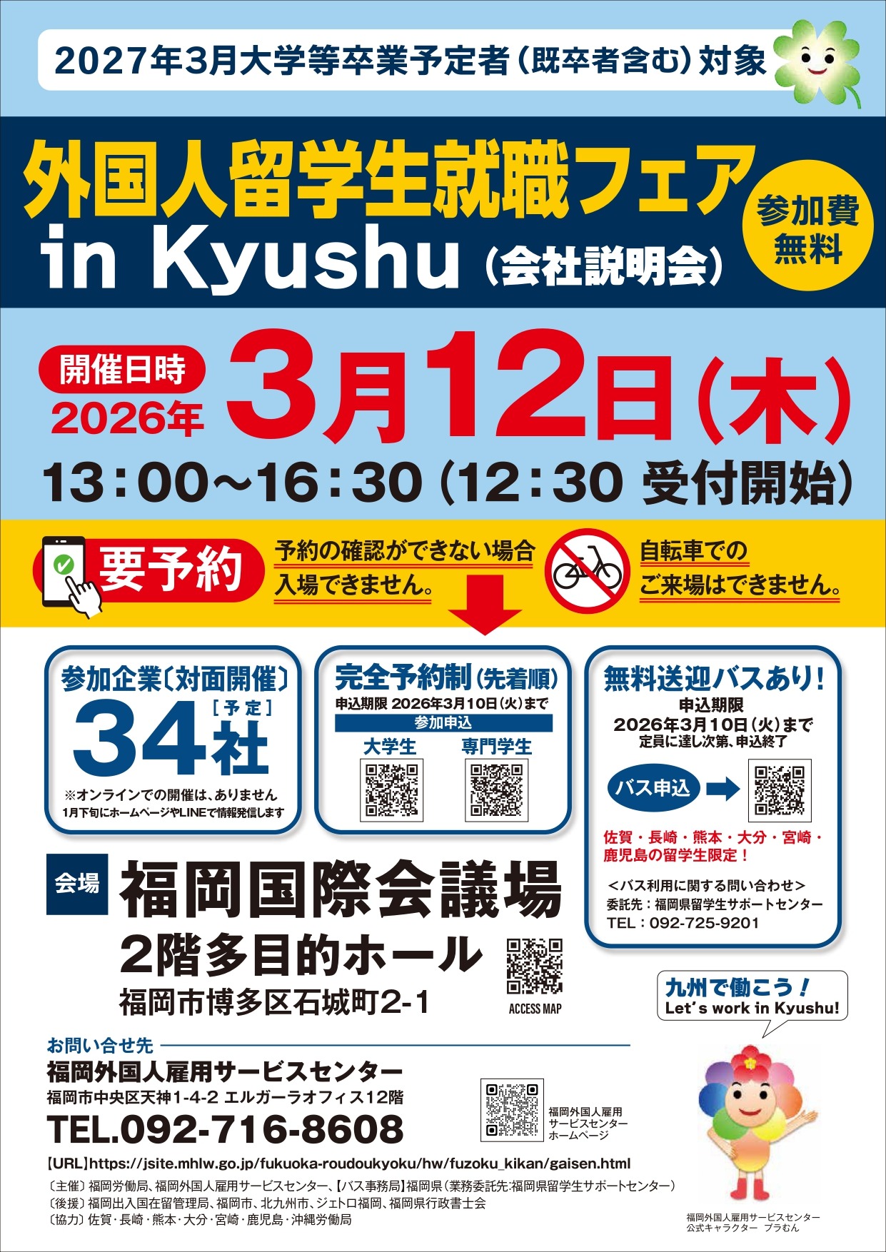福岡労働局、福岡外国人雇用サービスセンター、【バス事務局】福岡県(業務委託先:福岡県留学生サポートセンター)は、2027(令和9)年3月大学・専門学校等卒業予定の留学生(既卒者・海外大学卒業者を含む)を対象とした合同企業説明会「外国人留学生就職フェア in Kyushu」を開催します。